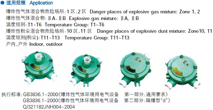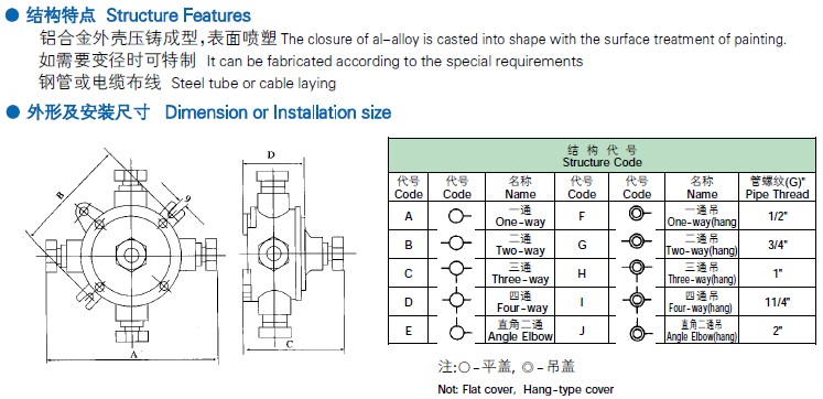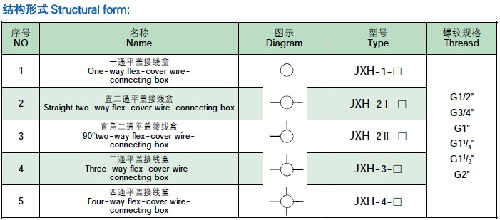 3-3-1 JXH 型铝合金(防水)防尘接线盒JXHAl(Water-proof) Dust-proof Junction Box产品描述:本品采用铸铝合金压铸而成,表面喷平纹漆;广泛适用于化工、轻工、纺织、机械及新建电厂等项目工程的钢管电缆布线。